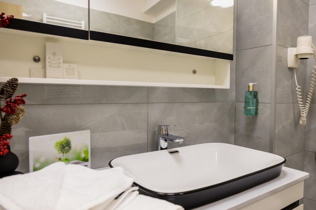 Baia privata impresioneaza prin designul modern, fiind dotata cu dus walk-in, halate de baie, papuci, articole de toaleta gratuite si uscator de par, pentru o experienta relaxanta si completa.